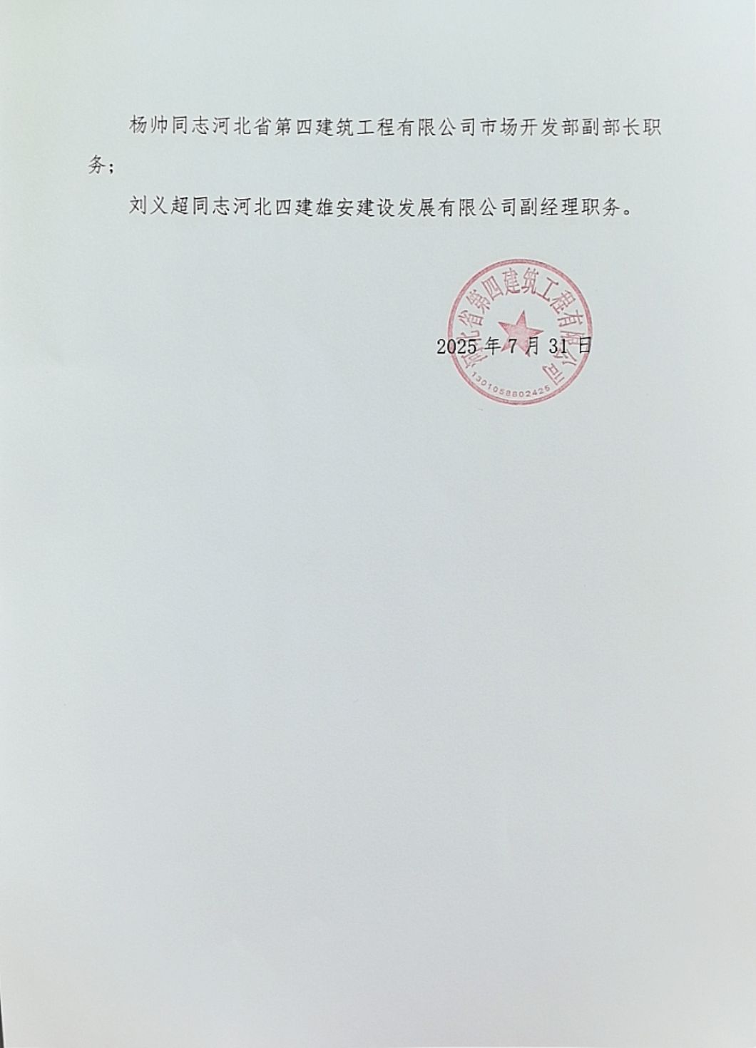 河北四建:关于刘宇等同志聘解职务的通知