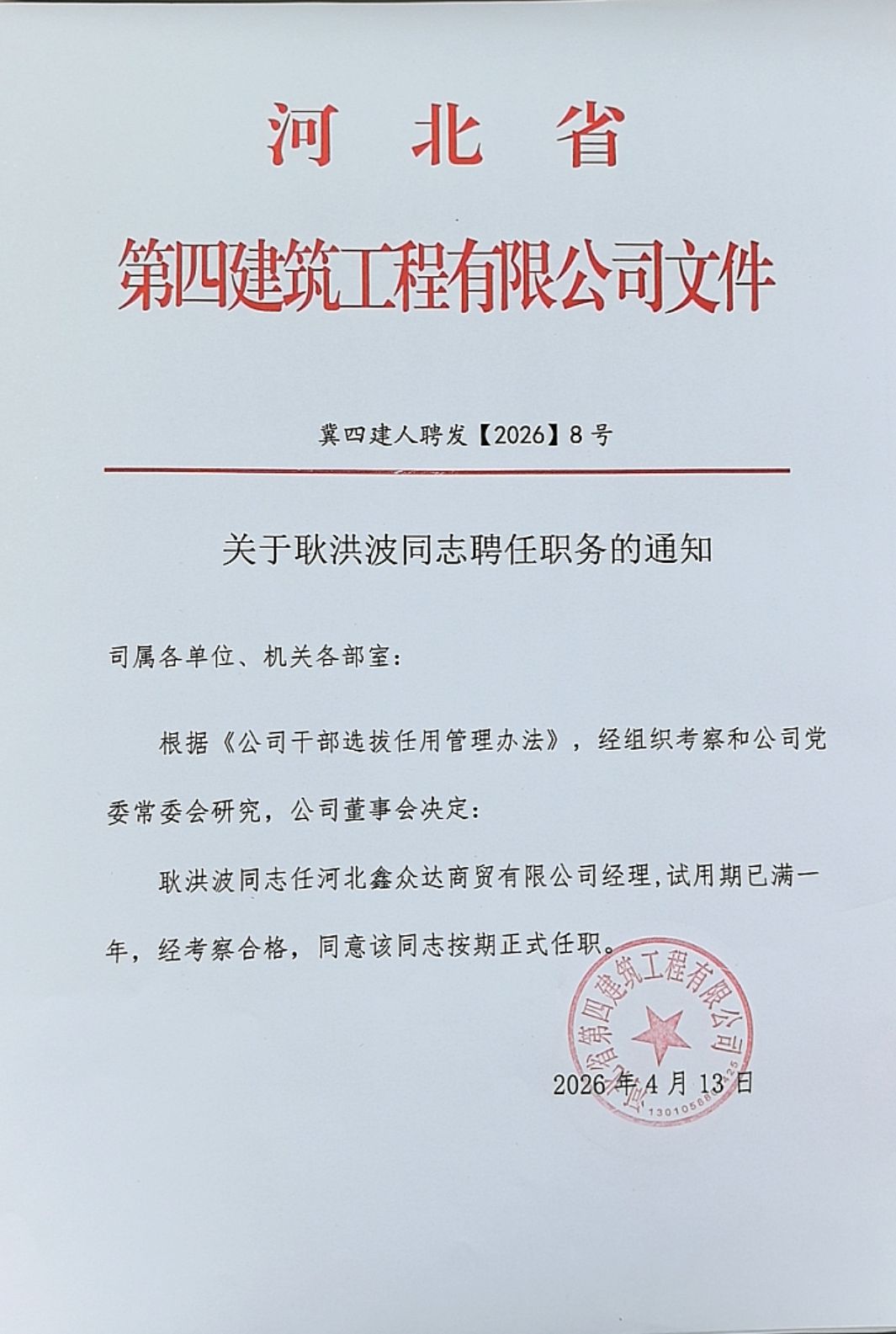 关于耿洪波同志聘任职务的通知